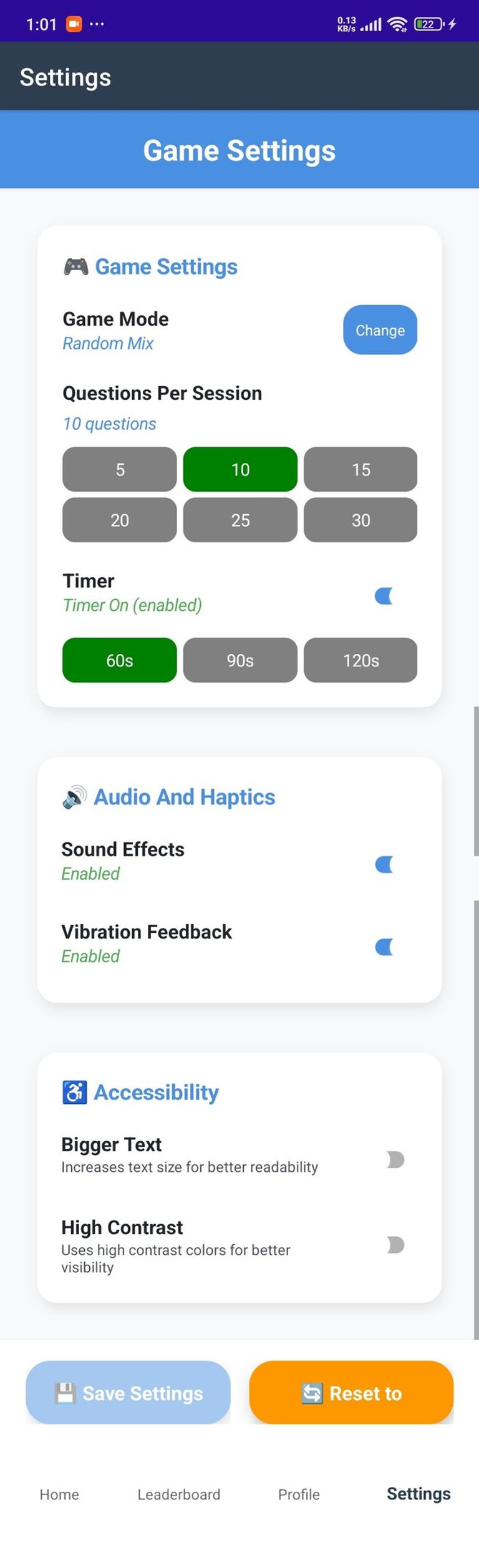 MathQuiz offers options like larger text and high contrast for better visibility and usability for all users.